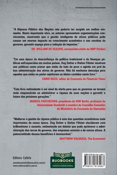 Melhorar a gestão da riqueza pública é uma das questões econômicas mais importantes da nossa época. O setor público tem demonstrado ser um péssimo administrador da riqueza que possui em mãos. Baseados em pesquisas e na experiência prática de muitos países, os autores mostram que governos do mundo inteiro, inclusive nações que hoje passam por crises financeiras, poderiam monetizar seus valiosos ativos de diversas formas. A principal sugestão para reverter o crescimento econômico enfraquecido é que os ativos públicos sejam entregues a uma gestão profissional de fundos, que lance mão do que há de melhor na administração corporativa.