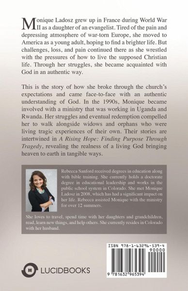 Monique Ladosz grew up in France during World War II as a daughter of an evangelist. Tired of the pain and depressing atmosphere of war-torn Europe, she moved to America as a young adult, hoping to find a brighter life. But challenges, loss, and pain continued there as she wrestled with the pressures of how to live the supposed Christian life. Through her struggles, she became acquainted with God in an authentic way. This is the story of how she broke through the church's expectations and came face-to-face with an authentic understanding of God. In the 1990s, Monique became involved with a ministry that was working in Uganda and Rwanda. Her struggles and eventual redemption compelled her to walk alongside widows and orphans who were living tragic experiences of their own. Their stories are intertwined in A Rising Hope: Finding Purpose Through Tragedy, revealing the realness of a living God bringing heaven to earth in tangible ways.