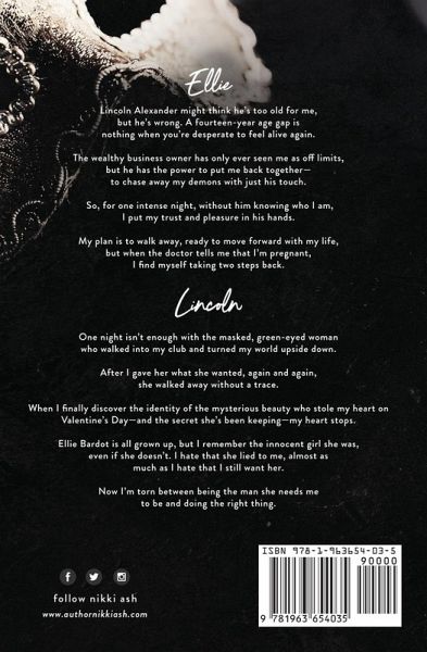 Ellie Lincoln Alexander might think he's too old for me, but he's wrong. A fourteen-year age gap is nothing when you're desperate to feel alive again. The wealthy business owner has only ever seen me as off limits, but he has the power to put me back together-to chase away my demons with just his touch. So, for one intense night, without him knowing who I am, I put my trust and pleasure in his hands. My plan is to walk away, ready to move forward with my life, but when the doctor tells me that I'm pregnant, I find myself taking two steps back. Lincoln One night isn't enough with the masked, green-eyed woman who walked into my club and turned my world upside down. After I gave her what she wanted, again and again, she walked away without a trace. When I finally discover the identity of the mysterious beauty who stole my heart on Valentine's Day-and the secret she's been keeping-my heart stops. Ellie Bardot is all grown up, but I remember the innocent girl she was, even if she doesn't. I hate that she lied to me, almost as much as I hate that I still want her. Now I'm torn between being the man she needs me to be and doing the right thing.