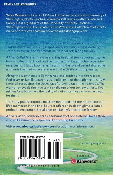 "Love is an uneasy river. It flows deep, with emotional currents that will not be contained in a single spot. Always moving, always evolving, it carries with it all the fragments of life it collects along the way..." A River Called Forever is a true and inspirational story about aging, life, love, and death. It chronicles the journey that begins when a twenty-nine year old baby boomer is thrust into the role of parental caregiver and ends twenty-two years later with the death of both parents. Along the way there are lighthearted explorations into the reasons God gives us families, parents as hooligans, and the patience to survive them, all set against the backdrop of growing up in the 1950-60's. The work also reveals the increasing challenge of our society as forty-five million Americans face the reality of caring for those who once cared for them. The story pivots around a mother's deathbed and the resurrection of life's memories in the final hours. It offers an in-depth glimpse into a profound encounter that altered one family's perception forever. A River Called Forever exists as a testament to hope-eternal for all those who will take on the responsibility of caring for others. Visit www.arivercalledforever.com for additional information.
