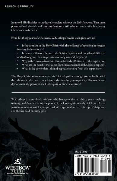 Jesus told His disciples not to leave Jerusalem without the Spirit's power. That same power to heal the sick and cast out demons is still relevant and available to every Christian who believes. From his thirty years of experience, W.K. Alsop answers such questions as: • Is the baptism in the Holy Spirit with the evidence of speaking in tongues for every believer today? • Is there a difference between the Spirit's baptism and the gifts of different kinds of tongues, the interpretation of tongues, and prophecy? • Why is there so much controversy in the body of Christ over this experience? • What are the benefits that come from this experience of the Spirit's baptism? • What is the power that I should expect to receive from this experience? The Holy Spirit desires to release this spiritual power through you as he did with the believers in the 1st century. Now is the time for you to pick up His mantle and demonstrate the power of the Holy Spirit in the 21st century!