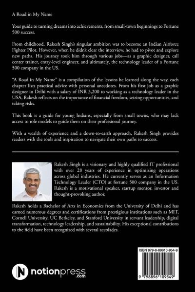 A Road in My Name Your guide to turning dreams into achievements, from small-town beginnings to Fortune 500 success. From childhood, Rakesh Singh's singular ambition was to become an Indian Airforce Fighter Pilot. However, when he didn't clear the interview, he had to pivot and explore new paths. His journey took him through various jobs-as a graphic designer, call center trainer, entry-level engineer, and ultimately, the technology leader of a Fortune 500 company in the US. "A Road in My Name" is a compilation of the lessons he learned along the way, each chapter lists practical advice with personal anecdotes. From his first job as a graphic designer in Delhi with a salary of INR 3,200 to working as a technology leader in the USA, Rakesh reflects on the importance of financial freedom, seizing opportunities, and taking risks. This book is a guide for young Indians, especially from small towns, who may lack access to role models to guide them on their professional journey. With a wealth of experience and a down-to-earth approach, Rakesh Singh provides readers with the tools and inspiration to navigate their own paths to success.