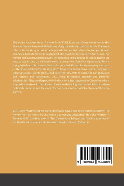 The main characters from "A Stone To Roll", Di, Rock, and Cheyenne, return as they try to find their way along the twisting road that is Life. Cheyenne returns to the Army on one last mission to avenge his dead comrades. Di finds her life is in upheaval, having sold her café to Betty Ann & Jake, her mother and aunt deceased, her childhood home in flames, Rock too busy to stay in touch, and Cheyenne too far away-emotionally and physically. Rock is trying to balance his business life and his personal life, and totally screwing it up, and as the three unlikely friends struggle to keep their heads above water, their paths intertwine again. Events take Di and Rock from Dry Hole to Tucson, to San Diego and San Antonio and Washington, D.C. , trying to balance business and relationships and desperate to find Cheyenne. Cheyenne is trapped somewhere in the middle of the chaos that is Afghanistan and Pakistan, where he finds his nemesis, and they meet for one last encounter, which only one of them can survive. E.R. "Gene" Wytrykus is the author of several novels and short stories, including "The Money Run" for which he also wrote a screenplay adaptation. He's also written "A Stone to Roll," (the first book in "The Connections Trilogy") and "On My Way Home" the third title in the series. He lives with his wife inLincoln, California
