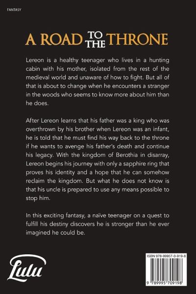 Lereon is a healthy teenager who lives in a hunting cabin with his mother, isolated from the rest of the medieval world and unaware of how to fight. But all of that is about to change when he encounters a stranger in the woods who seems to know more about him than he does. After Lereon learns that his father was a king who was overthrown by his brother when Lereon was an infant, he is told that he must find his way back to the throne if he wants to avenge his father's death and continue his legacy. With the kingdom of Berothia in disarray, Lereon begins his journey with only a sapphire ring that proves his identity and a hope that he can somehow reclaim the kingdom. But what he does not know is that his uncle is prepared to use any means possible to stop him. In this exciting fantasy, a naïve teenager on a quest to fulfill his destiny discovers he is stronger than he ever imagined he could be.