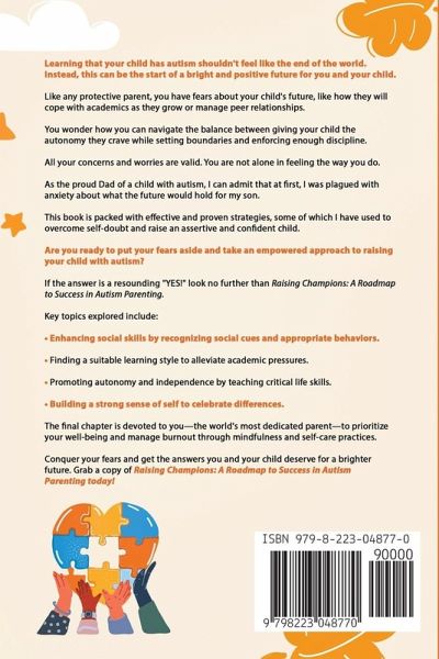 Learning that your child has autism shouldn't feel like the end of the world. Instead, this can be the start of a bright and positive future for you and your child. Like any protective parent, you have fears about your child's future, like how they will cope with academics as they grow or manage peer relationships. You wonder how you can navigate the balance between giving your child the autonomy they crave while setting boundaries and enforcing enough discipline. All your concerns and worries are valid. You are not alone in feeling the way you do. As the proud Dad of a child with autism, I can admit that at first, I was plagued with anxiety about what the future would hold for my son. This book is packed with effective and proven strategies, some of which I have used to overcome self-doubt and raise an assertive and confident child. Are you ready to put your fears aside and take an empowered approach to raising your child with autism? If the answer is a resounding "YES!" look no further than Raising Champions: A Roadmap to Success in Autism Parenting. Key topics explored include:Enhancing social skills by recognizing social cues and appropriate behaviors. Finding a suitable learning style to alleviate academic pressures. Promoting autonomy and independence by teaching critical life skills. Building a strong sense of self to celebrate differences. The final chapter is devoted to you-the world's most dedicated parent-to prioritize your well-being and manage burnout through mindfulness and self-care practices. Conquer your fears and get the answers you and your child deserve for a brighter future. Grab a copy of Raising Champions: A Roadmap to Success in Autism Parenting today!