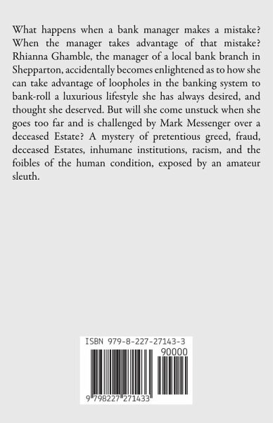 What happens when a bank manager makes a mistake? When the manager takes advantage of that mistake? Rhianna Ghamble, the manager of a local bank branch in Shepparton, accidentally becomes enlightened as to how she can take advantage of loopholes in the banking system to bank-roll a luxurious lifestyle she has always desired, and thought she deserved. But will she come unstuck when she goes too far and is challenged by Mark Messenger over a deceased Estate? A mystery of pretentious greed, fraud, deceased Estates, inhumane institutions, racism, and the foibles of the human condition, exposed by an amateur sleuth.