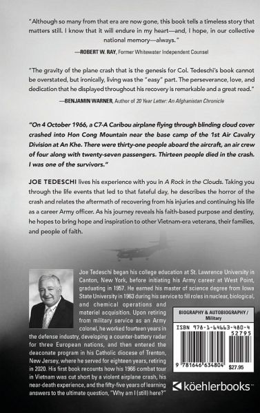 "On 4 October 1966, a C7-A Caribou airplane flying through blinding cloud cover crashed into Hon Cong Mountain near the base camp of the 1st Air Cavalry Division at An Khe. There were thirty-one people aboard the aircraft, an air crew of four along with twenty-seven passengers. Thirteen people died in the crash. I was one of the survivors." Joe Tedeschi lives his experience with you in A Rock in the Clouds. Taking you through the life events that led to that fateful day, he describes the horror of the crash and relates the aftermath of recovering from his injuries and continuing his life as a career Army officer. As his journey reveals his faith-based purpose and destiny, he hopes to bring hope and inspiration to other Vietnam-era veterans, their families, and people of faith. rockintheclouds.com