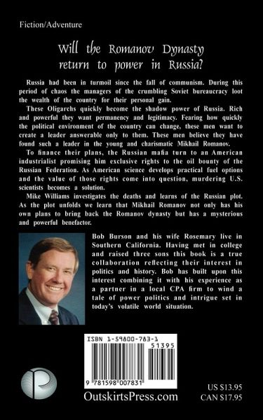 Will the Romanov Dynasty return to power in Russia? Russia had been in turmoil since the fall of communism. During this period of chaos the managers of the crumbling Soviet bureaucracy loot the wealth of the country for their personal gain. These Oligarchs quickly become the shadow power of Russia. Rich and powerful they want permanency and legitimacy. Fearing how quickly the political environment of the country can change, these men want to create a leader answerable only to them. These men believe they have found such a leader in the young and charismatic Mikhail Romanov. To finance their plans, the Russian mafia turn to an American industrialist promising him exclusive rights to the oil bounty of the Russian Federation. As American science develops practical fuel options and the value of those rights come into question, murdering U.S. scientists becomes a solution. Mike Williams investigates the deaths and learns of the Russian plot. As the plot unfolds we learn that Mikhail Romanov not only has his own plans to bring back the Romanov dynasty but has a mysterious and powerful benefactor.