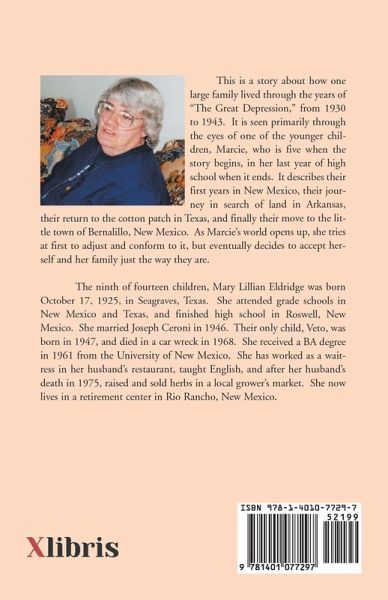 This is a story about how one large family lived through the years of "The Great Depression," from 1930 to 1943. It is seen primarily through the eyes of one of the younger children, Marcie, who is five when the story begins, in her last year of high school when it ends. It describes their first years in New Mexico, their journey in search of land in Arkansas, their return to the cotton patch in Texas, and finally their move to the little town of Bernalillo, New Mexico. As Marcie's world opens up, she tries at first to adjust and conform to it, but eventually decides to accept herself and her family just the way they are.…mehr