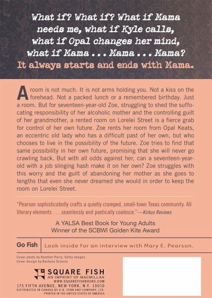 A room is not much. It is not arms holding you. Not a kiss on the forehead. Not a packed lunch or a remembered birthday. Just a room. But for seventeen-year-old Zoe, struggling to shed the suffocating responsibility of her alcoholic mother and the controlling guilt of her grandmother, a rented room on Lorelei Street is a fierce grab for control of her own future. Zoe rents her room from Opal Keats, an eccentric old lady who has a difficult past of her own, but who chooses to live in the possibility of the future. Zoe tries to find that same possibility in her own future, promising that she will never go crawling back. But with all odds against her, can a seventeen-year-old with a job slinging hash make it on her own? Zoe struggles with this worry and the guilt of abandoning her mother as she goes to lengths that even she never dreamed she would in order to keep the room on Lorelei Street.