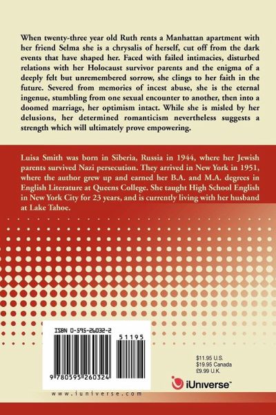 When twenty-three year old Ruth rents a Manhattan apartment with her friend Selma she is a chrysalis of herself, cut off from the dark events that have shaped her. Faced with failed intimacies, disturbed relations with her Halocaust survivor parents and the enigma of a deeply felt but unremembered sorrow, she clings to her faith in the future. Severed from memories of incest abuse, she is the eternal ingenue, stumbling from one sexual encounter to another, then into a doomed marriage, her optimism intact. While she is misled by her deulusions, her determined romanticism nevertheless suggests a strength which will ultimately prove empowering.