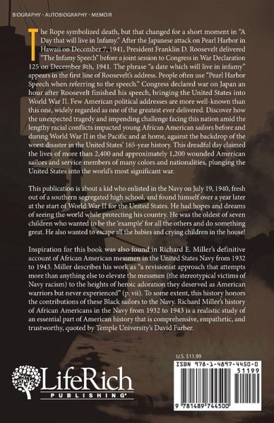 The Rope symbolized death, but that changed for a short moment in "A Day that will live in Infamy." After the Japanese attack on Pearl Harbor in Hawaii on December 7, 1941, President Franklin D. Roosevelt delivered "The Infamy Speech" before a joint session to Congress in War Declaration 125 on December 8th, 1941. The phrase "a date which will live in infamy" appears in the first line of Roosevelt's address. People often use "Pearl Harbor Speech when referring to the speech." Congress declared war on Japan an hour after Roosevelt finished his speech, bringing the United States into World War II. Few American political addresses are more well-known than this one, widely regarded as one of the greatest ever delivered. Discover how the unexpected tragedy and impending challenge facing this nation amid the lengthy racial conflicts impacted young African American sailors before and during World War II in the Pacific and at home, against the backdrop of the worst disaster in the United States' 165-year history. This dreadful day claimed the lives of more than 2,4000 and approximately 1,200 wounded American sailors and service members of many colors and nationalities, plunging the United States into the world's most significant war. This publication is about a kid who enlisted in the Navy on July 19, 1940, fresh out of a southern segregated high school, and found himself over a year later at the start of World War II for the United States. He had hopes and dreams of seeing the world while protecting his country. He was the oldest of seven children who wanted to be the 'example' for all the others and do something great. He also wanted to escape all the babies and crying children in the house! Inspiration for this book was also found in Richard E. Miller's definitive account of African American messmen in the United States Navy from 1932 to 1943. Miller describes his work as "a revisionist approach that attempts more than anything else to elevate the messmen (the stereotypical victims of Navy racism) to the heights of heroic adoration they deserved as American warriors but never experienced" (p. vii). To some extent, this history honors the contributions of these Black sailors to the Navy. Richard Miller's history of African Americans in the Navy from 1932 to 1943 is a realistic study of an essential part of American history that is comprehensive, empathetic, and trustworthy, quoted by Temple University's David Farber.