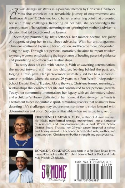 A Rose Amongst the Weeds is a poignant memoir by Christene Chadwick Moss chronicles her remarkable journey of empowerment and resilience. At age 17, Christene found herself at a turning point that presented her with many challenges. Reflecting on her past, she acknowledges the consequences of her actions, stemming from ignoring her mother's advice-a decision that led to profound life lessons. Seemingly punished by life's setbacks, her mother became her pillar of support, urging her to rise above adversity. With her encouragement, Christene continued to pursue her education and became more independent along the way. Through her narrative, she aims to impart wisdom to young women, emphasizing the importance of heeding parental guidance and prioritizing education over relationships. The story does not end with hardship. With unwavering determination, she moved forward with her two children, leaving behind the past, and forging a fresh path. Her perseverance ultimately led her to a successful career in politics, where she served 29 years as a Fort Worth Independent School District Board Trustee. Along the way, Christene formed meaningful relationships that enriched her life and contributed to her personal growth. Today, her community immortalizes her legacy with an elementary school and a children's library dedicated in her honor. A Rose Amongst the Weeds is a testament to her indomitable spirit, reminding readers that no matter how daunting life's challenges may be, one must strive forward with determination and effort. Success is attainable when we refuse to give up.