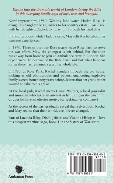 Escape into the dramatic world of London during the Blitz in this sweeping family saga of love, war and betrayal. Northamptonshire: 1980: Wealthy landowner, Hadan Rose, is dying. His daughter, May, rushes to his country estate, Rose Park, with her daughter, Rachel, to nurse him through his final days. In the afternoons, while Hadan sleeps, May tells Rachel about her wartime experiences. In 1940, Three of the four Rose sisters leave Rose Park to serve the war effort. May, the youngest is left behind. But she soon runs away from home to join an ambulance crew in London. She experiences the horrors of the Blitz first-hand but what happens to her there has remained secret her whole life. In 1980, at Rose Park, Rachel wanders through the old house, looking at old photographs and papers, uncovering explosive family secrets from ninety years before. Secrets that her grandfather wanted to take to his grave. At the local pub, Rachel meets Daniel Walters, a local journalist and musician who takes an interest in her. But can she trust him, or does he have an ulterior motive for seeking her company? As the secrets of the past gradually reveal themselves, both Rachel and May realise that their worlds are forever changed. Fans of Lucinda Riley, Dinah Jeffries and Victoria Hislop will love this escapist wartime saga, Book 1 in the Sisters of War series. "Brilliant book... I couldn't put it down." Amazon Reviewer "I absolutely loved this book..." Amazon Reviewer "Fascinating dual time-line novel..." Amazon Reviewer "The tumultuous WWII period of Britain was deftly and poignantly rendered. The time lines were beautifully woven together and the tempo of the book was perfect." Amazon Reviewer "This is a fast-paced plot with unexpected twists, fascinating characters, and a fresh look at life in London during the Blitz. I highly recommend it and look forward to reading more about the Rose sisters." Goodreads Reviewer