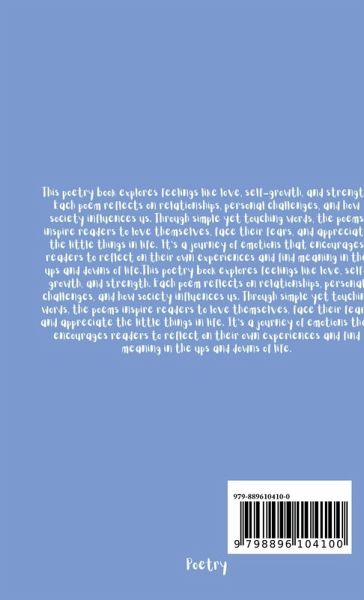 This poetry book explores feelings like love, self-growth, and strength. Each poem reflects on relationships, personal challenges, and how society influences us. Through simple yet touching words, the poems inspire readers to love themselves, face their fears, and appreciate the little things in life. It's a journey of emotions that encourages readers to reflect on their own experiences and find meaning in the ups and downs of life.