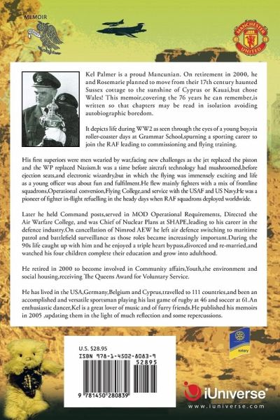 Kel Palmer is a proud Mancunian. On retirement in 2000, he and Rosemarie planned to move from their 17th century haunted Sussex cottage to the sunshine of Cyprus or Kauai, but chose Wales! This memoir, covering the 76 years he can remember, is written so that chapters may be read in isolation avoiding autobiographic boredom. It depicts life during WW2 as seen through the eyes of a young boy, via roller-coaster days at Grammar School, spurning a sporting career to join the RAF leading to commissioning and flying training. His first superiors were men wearied by war, facing new challenges as the jet replaced the piston and the WP replaced Nazism. It was a time before aircraft technology had mushroomed, before ejection seats, and electronic wizardry, but in which the flying was immensely exciting and life as a young officer was about fun and fulfillment. He flew mainly fighters with a mix of frontline squadrons, Operational conversion, Flying College, and service with the USAF and US Navy. He was a pioneer of fighter in-flight refueling in the heady days when RAF squadrons deployed worldwide. Later he held Command posts, served in MOD Operational Requirements, Directed the Air Warfare College, and was Chief of Nuclear Plans at SHAPE, leading to his career in the defence industry. On cancellation of Nimrod AEW he left air defence switching to maritime patrol and battlefield surveillance as those roles became increasingly important. During the 90s life caught up with him and he enjoyed a triple heart bypass, divorced and re-married, and watched his four children complete their education and grow into adulthood. He retired in 2000 to become involved in Community affairs, Youth, the environment and social housing, receiving The Queens Award for Voluntary Service. He has lived in the USA, Germany, Belgium and Cyprus, travelled to 111 countries, and been an accomplished and versatile sportsman playing his last game of rugby at 46 and soccer at 61.An enthusiastic dancer, Kel is a great lover of music and of furry friends. He published his memoirs in 2005 ,updating them in the light of much reflection and some repercussions.