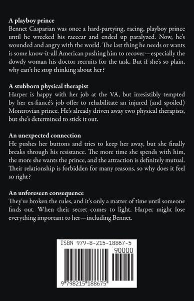 A playboy prince Bennet Casparian was once a hard-partying, racing, playboy prince until he wrecked his racecar and ended up paralyzed. Now, he's wounded and angry with the world. The last thing he needs or wants is some know-it-all American pushing him to recover-especially the dowdy woman his doctor recruits for the task. But if she's so plain, why can't he stop thinking about her? A stubborn physical therapist Harper is happy with her job at the VA, but irresistibly tempted by her ex-fiancé's job offer to rehabilitate an injured (and spoiled) Montrovian prince. He's already driven away two physical therapists, but she's determined to stick it out. An unexpected connection He pushes her buttons and tries to keep her away, but she finally breaks through his resistance. The more time she spends with him, the more she wants the prince, and the attraction is definitely mutual. Their relationship is forbidden for many reasons, so why does it feel so right? An unforeseen consequence They've broken the rules, and it's only a matter of time until someone finds out. When their secret comes to light, Harper might lose everything important to her-including Bennet.