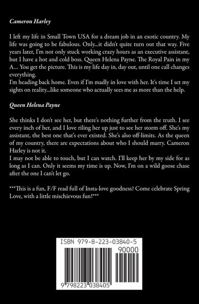 Cameron Harley I left my life in Small Town USA for a dream job in an exotic country. My life was going to be fabulous. Only...it didn't quite turn out that way. Five years later, I'm not only stuck working crazy hours as an executive assistant, but I have a hot and cold boss. Queen Helena Payne. The Royal Pain in my A… You get the picture. This is my life day in, day out, until one call changes everything. I'm heading back home. Even if I'm madly in love with her. It's time I set my sights on reality...like someone who actually sees me as more than the help. Queen Helena Payne She thinks I don't see her, but there's nothing further from the truth. I see every inch of her, and I love riling her up just to see her storm off. She's my assistant, the best one that's ever existed. She's also off-limits. As the queen of my country, there are expectations about who I should marry. Cameron Harley is not it. I may not be able to touch, but I can watch. I'll keep her by my side for as long as I can. Only it seems my time is up. Now, I'm on a wild goose chase after the one I can't let go. ***This is a fun, F/F read full of Insta-love goodness! Come celebrate Spring Love, with a little mischievous fun!***