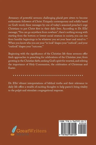 A treasury of powerful sermons challenging placid pew sitters to become enthusiastic followers of Christ. Uniquely contemporary and solidly based on God's word, these messages by one of today's seasoned preacher's urge Christians to put Christ first in their daily lives. According to Dr. Ellis' message, "You can go anywhere from nowhere", there's nothing wrong with starting from the bottom or lowest social stratum in society, you can rise from humble beginnings to be whatever you set your heart and mind to. " When you know who you are your "in look" shapes your "outlook", and your "outlook" shapes your "outcome." Beginning with the significance of the Christian life these sermons offer fresh approaches to preaching for celebrations of the Christian year; from growing in the Christian faith; seeking God's spirit for renewal, and reliving the importance of Holy Communion, the celebration of Christmas and Easter.