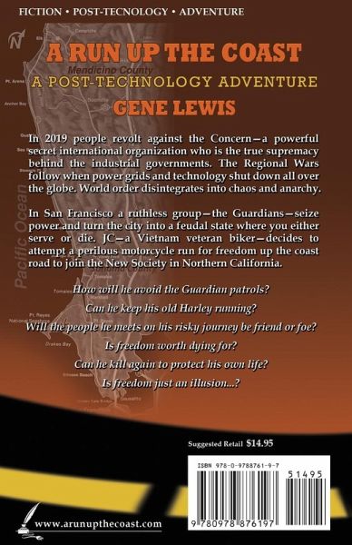 In 2019 people revolt against the Concern - a powerful secret international organization who is the true supremacy behind the industrial governments. The Regional Wars follow when power grids and technology shut down all over the globe. World order disintegrates into chaos and anarchy. In San Francisco a ruthless group - the Guardians - seize power and turn the city into a feudal state where you either serve or die. JC - a Vietnam veteran biker - decides to attempt a perilous motorcycle run for freedom up the coast road to join the New Society in Northern California. How will he avoid the Guardian patrols? Can he keep his old Harley running? Will the people he meets on his risky journey be friend or foe? Is freedom worth dying for? Can he kill again to protect his own life? Is freedom just an illusion...?