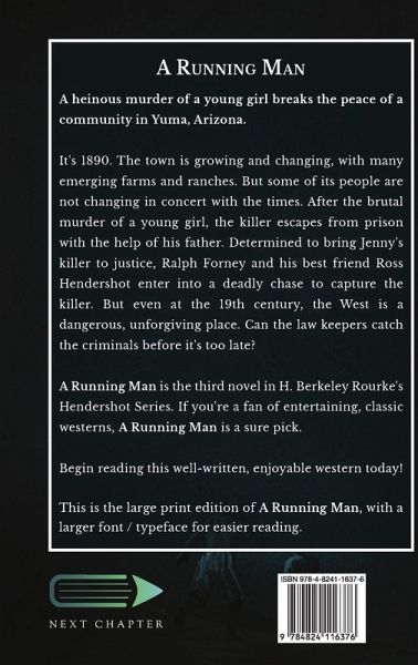 A heinous murder of a young girl breaks the peace of a community in Yuma, Arizona. It's 1890. The town is growing and changing, with many emerging farms and ranches. But some of its people are not changing in concert with the times. After the brutal murder of a young girl, the killer escapes from prison with the help of his father. Determined to bring Jenny's killer to justice, Ralph Forney and his best friend Ross Hendershot enter into a deadly chase to capture the killer. But even at the 19th century, the West is a dangerous, unforgiving place. Can the law keepers catch the criminals before it's too late? A Running Man is the third novel in H. Berkeley Rourke's Hendershot Series. If you're a fan of entertaining, classic westerns, A Running Man is a sure pick. Begin reading this well-written, enjoyable western today! This is the large print edition of A Running Man, with a larger font / typeface for easier reading.