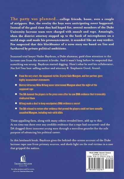 The party was planned . . . college friends, booze, even a couple of strippers. But, the revelry the boys were anticipating never happened. Instead of the good time they had hoped for, several members of the Duke University lacrosse team were charged with assault and rape. Amazingly, when the district attorney stepped up to the bank of microphones on a world stage and made his pronouncement, it soulded like an easy verdict. Few suspected that this blockbuster of a news story was based on lies and furthered by private political ambitions. Seasoned trial lawyer Nader Baydoun, a Duke alumnus, paid close attention to the lacrosse case from the moment it broke. And it wasn't long before he suspected that something was wrong. Baydoun started digging. here's what he and his collaborator, New York Times best-selling author and attorney R. Stephanie Good, found: From the very start, the supposed victim, Crystal Gale Mangum, and her partner, gave highly inconsistent statements District Attorney Mike Nifong never interviewed Mangum about the night of the supposed rape The DA damned the players in the press even after he saw DNA evidence that irrevocably vindicated them Nifong made a deal to keep exculpatory DNA evidence a secret The DA refused to review other evidence that proved the players could not have sexually assaulted Mangum, including rock-solid alibis These appalling facts, along with many others revealed here, add up to this: At no time was there ever any credible evidence that a rape had occurred?and the DA dragged three innocent young men through a merciless gauntlet for the sole purpose of advancing his political career. In this landmark book, Baydoun gives the behind-the-scenes account of the Duke lacrosse rape case from primary sources, and sheds light on the real victims in a case that gripped the nation.