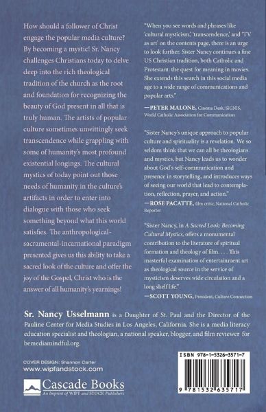 How should a follower of Christ engage the popular media culture? By becoming a mystic! Sr. Nancy challenges Christians today to delve deep into the rich theological tradition of the church as the root and foundation for recognizing the beauty of God present in all that is truly human. The artists of popular culture sometimes unwittingly seek transcendence while grappling with some of humanity's most profound existential longings. The cultural mystics of today point out those needs of humanity in the culture's artifacts in order to enter into dialogue with those who seek something beyond what this world satisfies. The anthropological-sacramental-incarnational paradigm presented gives us this ability to take a sacred look of the culture and offer the joy of the Gospel, Christ who is the answer of all humanity's yearnings!