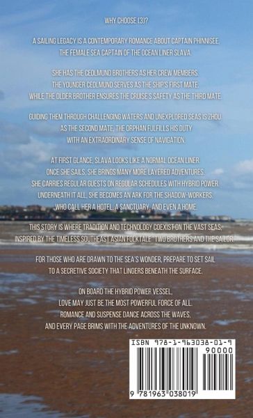 Why Choose (3)? A Sailing Legacy is a contemporary romance about Captain Phinnisee, the female sea captain of the ocean liner Slava. She has the Ceolmund brothers as her crew members. The younger Ceolmund serves as the ship's first mate, while the older brother ensures the cruise's safety as the third mate. Guiding them through challenging waters and unexplored seas is Zhou. As the second mate, the orphan fulfills his duty with an extraordinary sense of navigation. At first glance, Slava looks like a normal ocean liner. Once she sails, she brings many more layered adventures. She carries regular guests on regular schedules with hybrid power. Underneath it all, she becomes an ark for the Shadow-Workers, who call her a hotel, a sanctuary, and even a home. This story is where tradition and technology coexist on the vast seas, inspired by the timeless Southeast Asian folktale "Two Brothers and the Sailor." For those who are drawn to the sea's wonder, prepare to set sail to a secretive society that lingers beneath the surface. On board the hybrid power vessel, love may just be the most powerful force of all. Romance and suspense dance across the waves, and every page brims with the adventures of the unknown. NOTE: Printed and distributed by Ingram.