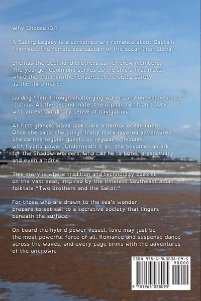 Why Choose (3)? A Sailing Legacy is a contemporary romance about Captain Phinnisee, the female sea captain of the ocean liner Slava. She has the Ceolmund brothers as her crew members. The younger Ceolmund serves as the ship's first mate, while the older brother ensures the cruise's safety as the third mate. Guiding them through challenging waters and unexplored seas is Zhou. As the second mate, the orphan fulfills his duty with an extraordinary sense of navigation. At first glance, Slava looks like a normal ocean liner. Once she sails, she brings many more layered adventures. She carries regular guests on regular schedules with hybrid power. Underneath it all, she becomes an ark for the Shadow-Workers, who call her a hotel, a sanctuary, and even a home. This story is where tradition and technology coexist on the vast seas, inspired by the timeless Southeast Asian folktale "Two Brothers and the Sailor." For those who are drawn to the sea's wonder, prepare to set sail to a secretive society that lingers beneath the surface. On board the hybrid power vessel, love may just be the most powerful force of all. Romance and suspense dance across the waves, and every page brims with the adventures of the unknown. NOTE: Printed and distributed by Ingram.