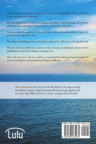 When the summer of 1968 dawned at the Jersey Shore, Xavier Martorelli was sure of who he was and where he was headed. But that special summer led him to question his Italian Catholic heritage, his strength, and racial and sexual bigotry that he had never before been aware of. However, under the guidance of three kind girls, older and unobtainable, he begins the process of learning to be a man. Thus began his lifelong journey of maturity and growth, while always chasing the truth. We have all had a bellwether summer at the precipice of adulthood, when we were petrified but awed by the changes occurring to us. This is the story of us, all of us, told in an emotional but whimsical nature through the eyes of a teenage boy and progressing through middle age.