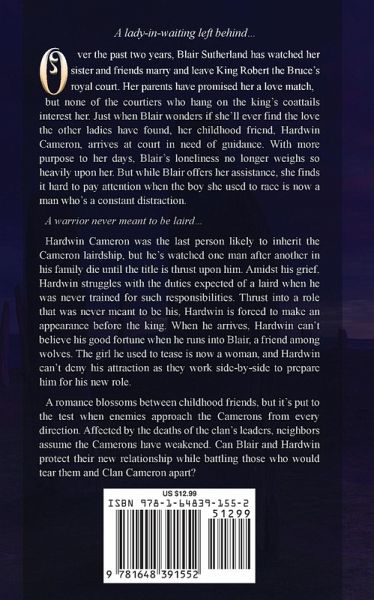 A lady-in-waiting left behind... Over the past two years, Blair Sutherland has watched her sister and friends marry and leave King Robert the Bruce's royal court. Her parents have promised her a love match, but none of the courtiers who hang on the king's coattails interest her. Just when Blair wonders if she'll ever find the love the other ladies have found, her childhood friend, Hardwin Cameron, arrives at court in need of guidance. With more purpose to her days, Blair's loneliness no longer weighs so heavily upon her. But while Blair offers her assistance, she finds it hard to pay attention when the boy she used to race is now a man who's a constant distraction. A warrior never meant to be laird... Hardwin Cameron was the last person likely to inherit the Cameron lairdship, but he's watched one man after another in his family die until the title is thrust upon him. Amidst his grief, Hardwin struggles with the duties expected of a laird when he was never trained for such responsibilities. Thrust into a role that was never meant to be his, Hardwin is forced to make an appearance before the king. When he arrives, Hardwin can't believe his good fortune when he runs into Blair, a friend among wolves. The girl he used to tease is now a woman, and Hardwin can't deny his attraction as they work side-by-side to prepare him for his new role. A romance blossoms between childhood friends, but it's put to the test when enemies approach the Camerons from every direction. Affected by the deaths of the clan's leaders, neighbors assume the Camerons have weakened. Can Blair and Hardwin protect their new relationship while battling those who would tear them and Clan Cameron apart?