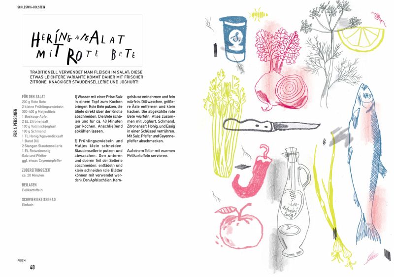 Wieso gibt es in Hessen Handkäs mit Musigg, warum ist dem Hund in Berlin so kalt und warum sind Nonnenfürze in Bayern süß? Und was verbirgt sich hinter klangvollen Namen wie Pfefferpotthast, Dibbelabbes und Oldenburger Mockturtle? Illustratorin Anni von Bergen zog ein Jahr lang durch das Land von Brezn' und Currywurst. Im Gepäck: Stift und Papier und eine gute Portion Neugier. Sie illustrierte und probierte sich durch die deutsche Küche, fragte Freunde und Verwandte, was sie aus der Heimat am liebsten essen und vermissen oder in ihrer neuen Heimat Leckeres lieben gelernt haben und komponierte mit den gesammelten Rezepten eine köstliche Mischung deutscher Spezialitäten.Gegliedert ist das Kochbuch in die Bundesländer, untermalt mit farbenfrohen, wilden Illustrationen der Speisen und der an den dazugehörigen Orten eingefangenen Stimmungen und Atmosphären.Herausgekommen ist ein feiner Augen- und Gaumenschmaus mit einer Prise Regionalität, einem guten Tropfen moderner Zubereitung und einem ordentlichen visuellen Nachschlag!