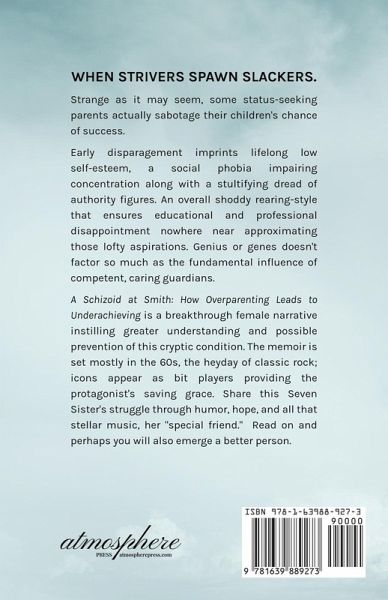 WHEN STRIVERS SPAWN SLACKERS. Strange as it may seem, some status-seeking parents actually sabotage their children's chance of success. Early disparagement imprints lifelong low self-esteem, a social phobia impairing concentration along with a stultifying dread of authority figures. An overall shoddy rearing-style that ensures educational and professional disappointment nowhere near approximating those lofty aspirations. Genius or genes doesn't factor so much as the fundamental influence of competent, caring guardians. A Schizoid at Smith: How Overparenting Leads to Underachieving is a breakthrough female narrative instilling greater understanding and possible prevention of this cryptic condition. The memoir is set mostly in the 60s, the heyday of classic rock; icons appear as bit players providing the protagonist's saving grace. Share this Seven Sister's struggle through humor, hope, and all that stellar music, her "special friend." Read on and perhaps you will also emerge a better person.