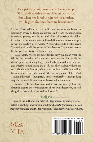 He's paid to make promises he'll never keep. She dreads nothing so much as empty words. But when he's hired to win her for another, will feigned fondness become literal love? Tyrone Ellsworth's career as a literary lover-in-lieu began at university, where he found amusement and steady spending-silver in writing poetry, love letters and offers of marriage for fellow Oxonians. So when schoolmate Gareth Boulton purchases his pen in order to win the wealthy Miss Agatha Weeks, what could be the harm? The task will be all the easier, in fact, because Tyrone has known her for years as his sister's dearest friend. Miss Agatha Weeks has never felt for any young man what she felt for the one who broke her heart years earlier. And while she doesn't pine for him any longer, she has begun to doubt there are any worthy, honest young men left. But then suddenly there are two! Mr. Gareth Boulton, whom she dismissed earlier as a callow fortune hunter, begins to reveal new depths in his pursuit of her. And Tyrone Ellsworth-thoughtful, scholarly, kind, comfortable through long acquaintance-if Tyrone cannot be trusted, no one can. Murder will out, however, and so will mendacity. Can the deceiver escape the consequences of his own deception, or will the beloved deceived be lost to him forever? ¿ A Scholarly Pursuit is the 4th book in the clean Regency romance series The Ellsworth Assortment. Each book can be read as a stand-alone or in order. ¿