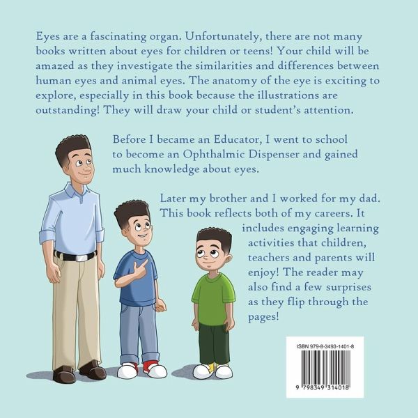 Eyes are a fascinating organ. Unfortunately, there are not many books written about eyes for children or teens! Your child will be amazed as they investigate the similarities and differences between human eyes and animal eyes. The anatomy of the eye is exciting to explore, especially in this book because the illustrations are outstanding! They will draw your child or student's attention. Before I became an Educator, I went to school to become an Ophthalmic Dispenser and gained much knowledge about eyes. Later my brother and I worked for my dad. This book reflects both of my careers. It includes engaging learning activities that children, teachers and parents will enjoy! The reader may also find a few surprises as they flip through the pages!