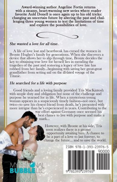 Award-winning author Angeline Fortin returns with a steamy, heart-warming new series where reader favorite Auld Donell is once again up to his old tricks: changing an uncertain future by altering the past and challenging three young women to test the limitations of time and explore the possibilities of love. She wanted a love for all time. A life of love lost and heartbreak has cursed the women in Bronte Hughes's family for generations. When she discovers a device that allows her to slip through time, Bronte decides the key to obtaining true love for herself lies in mending the tragedies of the past and restoring a legacy of love fate has robbed from her family…beginning with saving her great-great grandfather from setting sail on the ill-fated voyage of the Titanic. He searched for a life with purpose Good friends and a loving family provided Tris MacKintosh with ample duty and obligation but none of the challenge and purpose he yearned for in life. When a mysterious young woman appears in a suspiciously timely fashion-not once, but twice-to save his closest friend from death, he's presented with more intrigue than he's experienced in years. Contributing to the war effort against Germany once seemed his best chance to live with purpose and make a mark… However, with Bronte at his side, Tris soon realizes there is a greater opportunity awaiting him. A chance to be a part of a love to last forever, to change the future… and to save the world.