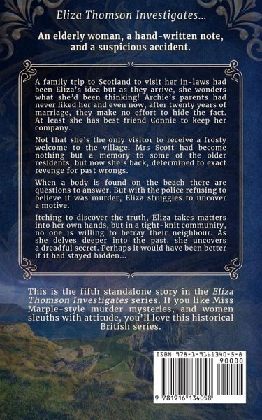 Long held secrets, revenge, and murder. Eliza Thomson Investigates... A suspicious accident, a hand-written note, and an old parish priest. A home coming doesn't go as planned in St Giles; a small village nestled on the east coast of Scotland. Widow, mother and former beauty, Mrs Scott once walked away from all things dear to her. She's a woman with a past, and now she's back, determined to exact revenge for previous wrongs. But somebody knows her plans, and they'll do whatever it takes to silence her. In a tight-knit community where no one betrays their neighbours, amateur sleuth Eliza Thomson and her friend Connie must step in to investigate... This is the fifth standalone story in the Eliza Thomson Investigates series. If you like Miss Marple-style murder mysteries, and women sleuths with attitude, you'll love this historical British series. Get your copy today! Books in the Eliza Thomson Investigates series: ¿A Deadly Tonic ¿Murder in Moreton ¿Death of an Honourable Gent ¿Dying for a Garden Party ¿A Scottish Fling ¿A Christmas Murder ¿The Palace Murder NB. This series is written in UK English