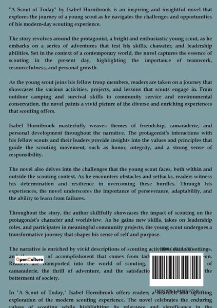 "A Scout of Today" by Isabel Hornibrook is an inspiring and insightful novel that explores the journey of a young scout as he navigates the challenges and opportunities of his modern-day scouting experience. The story revolves around the protagonist, a bright and enthusiastic young scout, as he embarks on a series of adventures that test his skills, character, and leadership abilities. Set in the context of a contemporary world, the novel captures the essence of scouting in the present day, highlighting the importance of teamwork, resourcefulness, and personal growth. As the young scout joins his fellow troop members, readers are taken on a journey that showcases the various activities, projects, and lessons that scouts engage in. From outdoor camping and survival skills to community service and environmental conservation, the novel paints a vivid picture of the diverse and enriching experiences that scouting offers. Isabel Hornibrook masterfully weaves themes of friendship, camaraderie, and personal development throughout the narrative. The protagonist's interactions with his fellow scouts and their leaders provide insights into the values and principles that guide the scouting movement, such as honor, integrity, and a strong sense of responsibility. The novel also delves into the challenges that the young scout faces, both within and outside the scouting context. As he encounters obstacles and setbacks, readers witness his determination and resilience in overcoming these hurdles. Through his experiences, the novel underscores the importance of perseverance, adaptability, and the ability to learn from failures. Throughout the story, the author skillfully showcases the impact of scouting on the protagonist's character and worldview. As he gains new skills, takes on leadership roles, and participates in meaningful community projects, the young scout undergoes a transformative journey that shapes his sense of self and purpose. The narrative is enriched by vivid descriptions of scouting activities, outdoor settings, and the sense of accomplishment that comes from tackling challenges head-on. Readers are transported into the world of scouting, experiencing the joy of camaraderie, the thrill of adventure, and the satisfaction of contributing to the betterment of society. In "A Scout of Today," Isabel Hornibrook offers readers a heartfelt and uplifting exploration of the modern scouting experience. The novel celebrates the enduring values of scouting while highlighting its relevance and significance in the contemporary world. Through the eyes of the young protagonist, readers are reminded of the potential for growth, self-discovery, and positive impact that scouting can offer to today's youth.