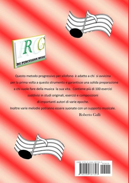 Questo metodo progressivo per xilofono è adatto a chi si avvicina per la prima volta a questo strumento e garantisce una solida preparazione a chi vuole fare della musica la sua vita. Contiene più di 100 esercizi suddivisi in studi originali, esercizi e composizioni di importanti autori di varie epoche. Inoltre varie melodie potranno essere suonate con un supporto musicale. Roberto Galli This progressive method for xylophone is suitable for those approaching for the first time in this instrument and guarantees a solid preparation who wants to make music his life. Contains more than 100 exercises divided into original studies, exercises and compositions of important authors of various ages. Moreover various melodies can be played with a musical support. Roberto Galli
