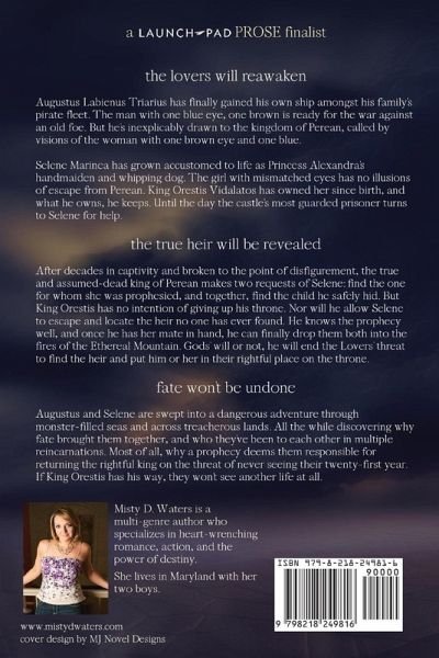 The lovers will reawaken. Augustus Labienus Triarius has finally gained his own ship amongst his family's pirate fleet. The man with one blue eye, one brown is ready for the war against an old foe. But he's inexplicably drawn to the kingdom of Perean, called by visions of the woman with one brown eye and one blue. Selene Marinea has grown accustomed to life as Princess Alexandra's handmaiden and whipping dog. The girl with mismatched eyes has no illusions of escape from Perean. King Orestis Vidalatos has owned her since birth, and what he owns, he keeps. Until the day the castle's most guarded prisoner turns to Selene for help. The true heir will be revealed. After decades in captivity and broken to the point of disfigurement, the true and assumed-dead king of Perean makes two requests of Selene: find the one for whom she was prophesied, and together, find the child he safely hid. But King Orestis has no intention of giving up his throne. Nor will he allow Selene to escape and locate the heir no one has ever found. He knows the prophecy well, and once he has her mate in hand, he can finally drop them both into the fires of the Ethereal Mountain. Gods' will or not, he will end the Lovers' threat to find the heir and put him or her in their rightful place on the throne. Fate won't be undone. Augustus and Selene are swept into a dangerous adventure through monster-filled seas and across treacherous lands. All the while discovering why fate brought them together, and who they've been to each other in multiple reincarnations. Most of all, why a prophecy deems them responsible for returning the rightful king on the threat of never seeing their twenty-first year. If King Orestis has his way, they won't see another life at all.