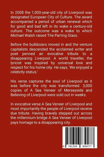 In 2008 the 1,000-year-old city of Liverpool was designated European City of Culture. The award accompanied a period of urban renewal which for good and bad left in its wake a century-old culture. The outcome was a wake to which Michael Walsh raised The Parting Glass. Before the bulldozers moved in and the venture capitalists descended the acclaimed writer and poet penned an evocative tribute to a disappearing Liverpool. A world traveller, the lyricist was inspired by universal love and respect for his home city. He says, 'We enjoyed a celebrity status.' His verse captures the soul of Liverpool as it was before the city was transformed. 3,000 copies of A Sea Veneer of Merseyside and Believing of Liverpool were sold out in weeks. In evocative verse A Sea Veneer of Liverpool and most importantly the people of Liverpool receive due tribute. Having bravely stepped out across the millennium bridge A Sea Veneer of Liverpool pays homage to a disappearing city.