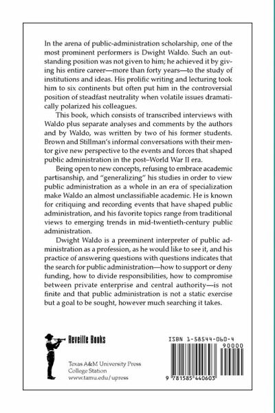 In the arena of public-administration scholarship, one of the most prominent performers is Dwight Waldo. Such an outstanding position was not given to him; he achieved it by giving his entire career--more than forty years--to the study of institutions and ideas. His prolific writing and lecturing took him to six continents but often put him in the controversial position of steadfast neutrality when volatile issues dramatically polarized his colleagues. This book, which consists of transcribed interviews with Waldo plus separate analyses and comments by the authors and by Waldo, was written by two of his former students. Brown and Stillman's informal conversations with their mentor give new perspective to the events and forces that shaped public administration in the post--World War II era. Being open to new concepts, refusing to embrace academic partisanship, and "generalizing" his studies in order to view public administration as a whole in an era of specialization make Waldo an almost unclassifiable academic. He is known for critiquing and recording events that have shaped public administration, and his favorite topics range from traditional views to emerging trends in mid-twentieth-century public administration scholars--the socalled Minnowbrook Conference--is an example of his receptiveness to change and to the probing of old ideas and new frontiers. Dwight Waldo is a preeminent interpreter of public administration as a profession, as he would like to see it, and his practice of answering questions with questions indicates that the search for public administration--how to support or deny funding, how to divide responsibilities, how to compromise between private enterprise and central authority--is not finite and that public administration is not a static exercise but a goal to be sought, however much searching it takes.