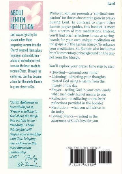 Philip St. Romain presents a "spiritual companion" for those who want to grow in prayer during Lent. In contrast to many other Lenten prayer guides, this booklet is more than a series of rote meditations. Instead, you will find brief reflections to use as springboards for your own unique meditation on the gospels of the Lenten liturgy. To enhance your meditation, a brief commentary or background on the gospel passage is also provided.