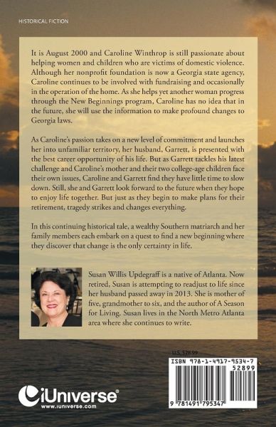 It is August 2000 and Caroline Winthrop is still passionate about helping women and children who are victims of domestic violence. Although her nonprofit foundation is now a Georgia state agency, Caroline continues to be involved with fundraising and occasionally in the operation of the home. As she helps yet another woman progress through the New Beginnings program, Caroline has no idea that in the future, she will use the information to make profound changes to Georgia laws. As Caroline's passion takes on a new level of commitment and launches her into unfamiliar territory, her husband, Garrett, is presented with the best career opportunity of his life. But as Garrett tackles his latest challenge and Caroline's mother and their two college-age children face their own issues, Caroline and Garrett find they have little time to slow down. Still, she and Garrett look forward to the future when they hope to enjoy life together. But just as they begin to make plans for their retirement, tragedy strikes and changes everything. In this continuing historical tale, a wealthy Southern matriarch and her family members each embark on a quest to find a new beginning where they discover that change is the only certainty in life.