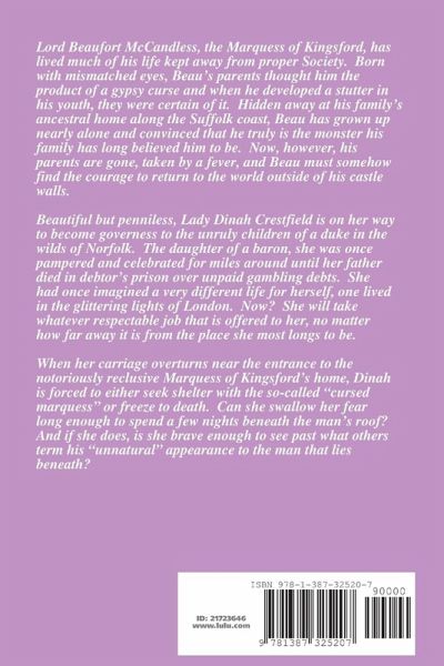 Lord Beaufort McCandless, the Marquess of Kingsford, has lived much of his life kept away from proper Society. Born with mismatched eyes, Beau's parents thought him the product of a gypsy curse. Hidden away at his family's ancestral home along the Suffolk coast, Beau has grown up nearly alone. Beautiful but penniless, Lady Dinah Crestfield is on her way to become governess to the unruly children of a duke in the wilds of Norfolk. The daughter of a baron, she was once pampered and celebrated for miles around until her father died in debtor's prison over unpaid gambling debts. When her carriage overturns near the entrance to the notoriously reclusive Marquess of Kingsford's home, Dinah is forced to either seek shelter with the so-called "cursed marquess" or freeze to death. Can she swallow her fear long enough to spend a few nights beneath the man's roof and is she brave enough to see what lies beneath the man's appearance?