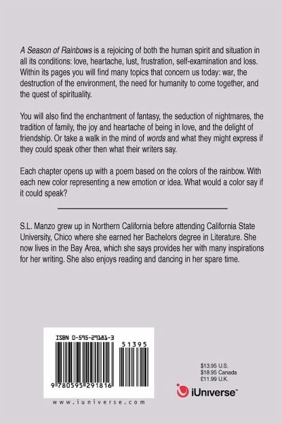 A Season of Rainbows is a rejoicing of both the human spirit and situation in all its conditions: love, heartache, lust, frustration, self-examination and loss. Within its pages you will find many topics that concern us today: war, the destruction of the environment, the need for humanity to come together, and the quest of spirituality. You will also find the enchantment of fantasy, the seduction of nightmares, the tradition of family, the joy and heartache of being in love, and the delight of friendship. Or take a walk in the mind of words and what they might express if they could speak other then what their writers say. Each chapter opens up with a poem based on the colors of the rainbow. With each new color representing a new emotion or idea. What would a color say if it could speak?