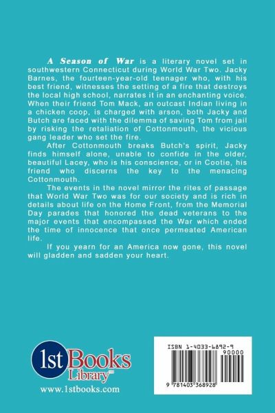 In A Season of War 14-year-old Jacky captivates as he weaves a story of arson, unrequited love, and friendship during World War Two and the events that marked the rites of passage for an America now gone.