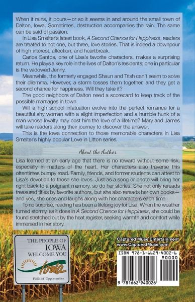 When it rains, it pours-or so it seems in and around the small town of Dalton, Iowa. Sometimes, destruction accompanies the rain. The same can be said of passion. In Lisa Smelter's latest book, A Second Chance for Happiness, readers are treated to not one, but three, love stories. That is indeed a downpour of high interest, affection, and heartbreak. Carlos Santos, one of Lisa's favorite characters, makes a surprising return. He plays a key role in the lives of Dalton's residents; one in particular is the widowed Jenny. Meanwhile, the formerly engaged Shaun and Trish can't seem to solve their dilemma. However, a storm tosses them together, and they get a second chance for happiness. Will they take it? The good neighbors of Dalton need a scorecard to keep track of the possible marriages in town. Will a high school infatuation evolve into the perfect romance for a beautiful shy woman with a slight imperfection and a humble hunk of a man whose loyalty may cost him the love of a lifetime? Mary and James will take readers along their journey to discover the answer. This is the Iowa connection to those memorable characters in Lisa Smelter's highly popular Love in Litton series.