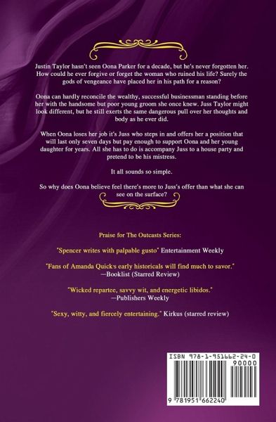 Justin Taylor hasn't seen Oona Parker for a decade, but he's never forgotten her. How could he ever forgive or forget the woman who ruined his life? Surely the gods of vengeance have placed her in his path for a reason? Oona can hardly reconcile the wealthy, successful businessman standing before her with the handsome but poor young groom she once knew. Juss Taylor might look different, but he still exerts the same dangerous pull over her thoughts and body as he ever did. When Oona loses her job it's Juss who steps in and offers her a position that will last only seven days but pay enough to support Oona and her young daughter for years. All she has to do is accompany Juss to a house party and pretend to be his mistress. It all sounds so simple. So why does Oona believe feel there's more to Juss's offer than what she can see on the surface? Praise for Minerva Spencer & S.M. LaViolette's THE ACADEMY OF LOVE: "[A] pitch perfect Regency .... Readers will be hooked." (THE MUSIC OF LOVE)¿Publishers Weekly STARRED REVIEW "[A] consistently entertaining read." (A FIGURE OF LOVE)Kirkus