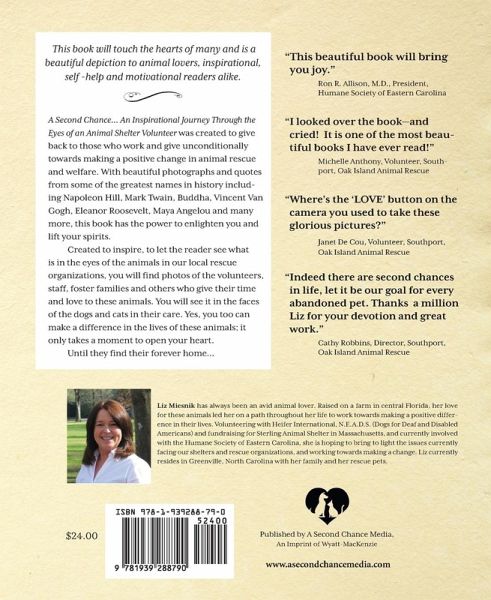 "A Second Chance... An Inspirational Journey through the Eyes of an Animal Shelter Volunteer" was created to give back to those that work and give unconditionally towards making a positive change in animal rescue and welfare. With beautiful photographs and quotes from some of the greatest names in history including Napoleon Hill, Mark Twain, Buddha, Vincent Van Gogh, Eleanor Roosevelt, Maya Angelou and many more, this book will enlighten your mind and lift your spirits. This book was created to inspire, to let the reader see what is in the eyes of the animals in our local rescue organizations. This book was not intended to be depressing, but on the contrary, to inspire and motivate. You will see it in the photos of the volunteers, staff, foster families and others who give their time and love to these animals, you will see it in the faces of the dogs and cats in their care. This book will touch the hearts of many and is a beautiful depiction to animal lovers, inspirational, self -help and motivational readers alike. Yes, you too can make a difference in the lives of these animals; it only takes a moment to open your heart. Until they find their forever home...